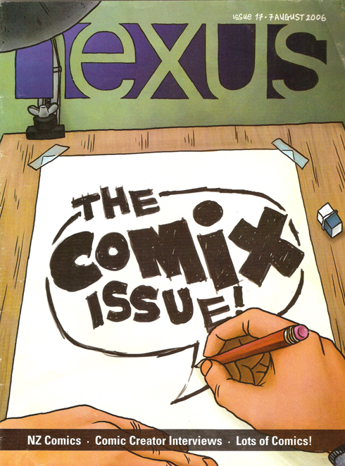 In mid 2006 Nexus Magazine designer Matt Scheurich took inspiration from a recent comics issue of Vice magazine and produced a comics-centric issue of the Waikato University magazine for their 7th August 2006 edition. The full colour magazine featured cartoons from local contributors as well articles and regular columns in cartoon form. Matt interviewed a few New Zealand cartoonists including Ant Sang.